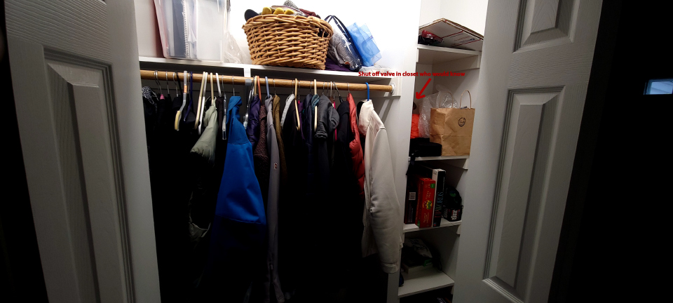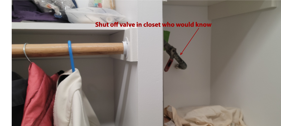 Here, some items are moved, and the shut-off is easier to see, but you still have to know where to look. Not so great if you are in a panic to stop the water flooding the house.