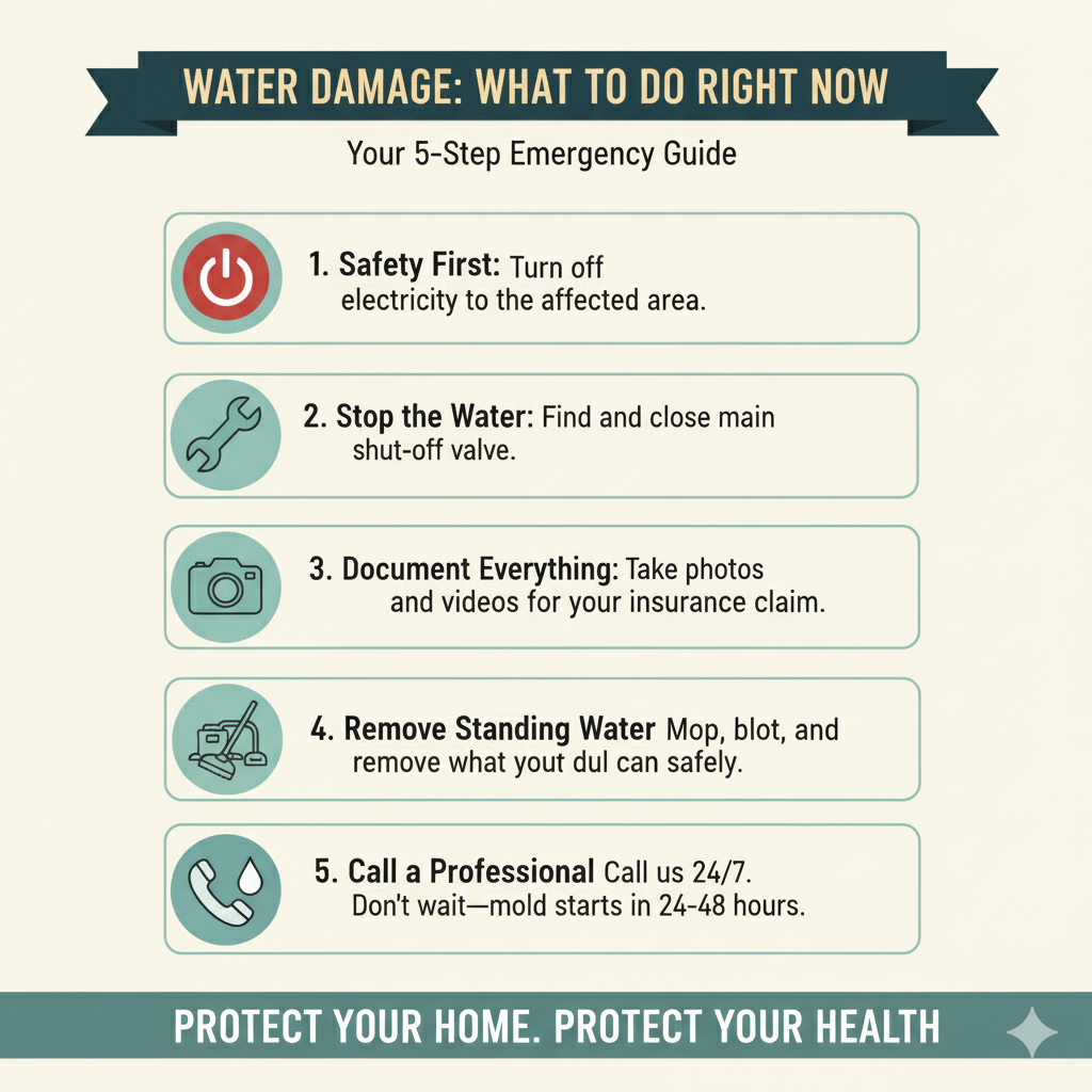 - Remove Standing Water: Mop, blot, and remove what you can safely.