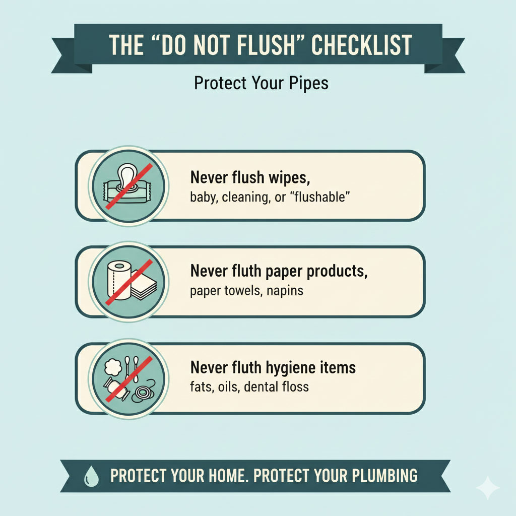 - [ ] Never flush “flushable” wipes, baby wipes, or cleaning wipes. (They will clog your pipes and are the #1 cause of sewage backups.)