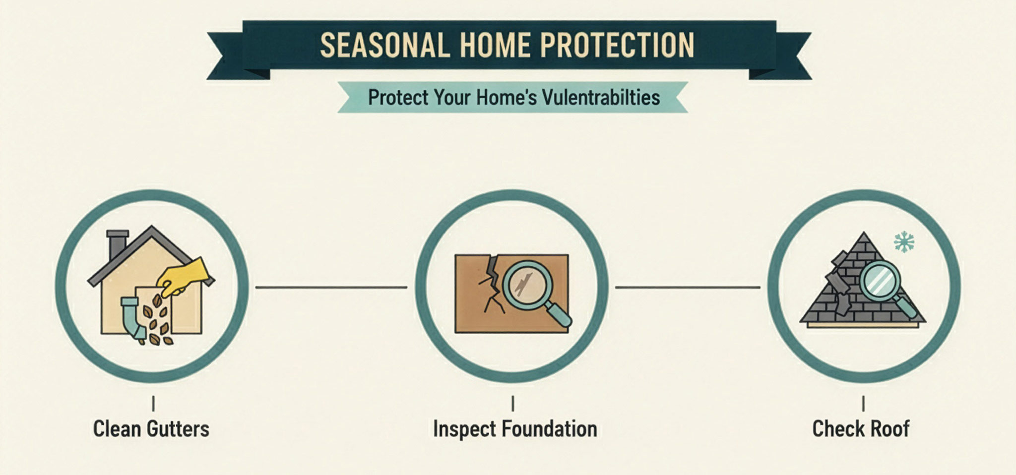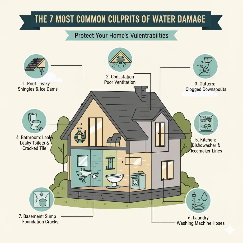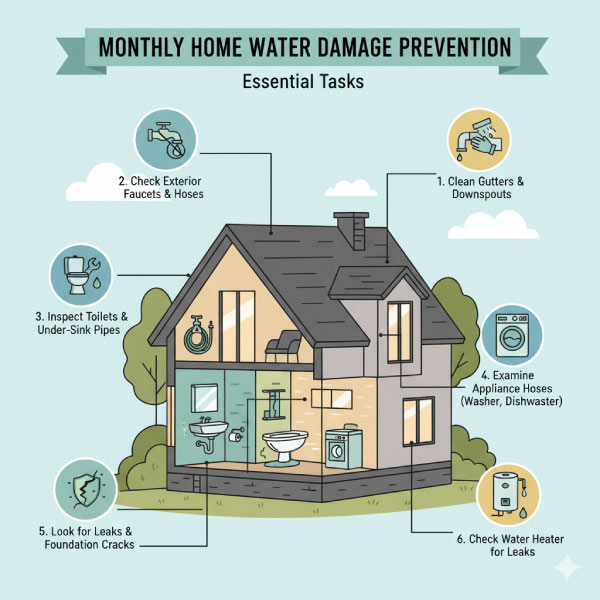 Water damage prevention requires a systematic approach combining routine maintenance, seasonal preparations, and emergency readiness. The most effective prevention strategies focus on the primary causes: plumbing failures (38% of claims), appliance malfunctions, HVAC issues, and weather-related damage.