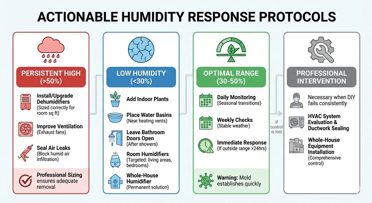 Optimal range maintenance at 30-50% humidity requires daily monitoring during seasonal transitions and weekly checks during stable weather. Immediate response becomes necessary when readings drift outside target ranges for more than 24 hours, as mold can establish quickly under favorable conditions.