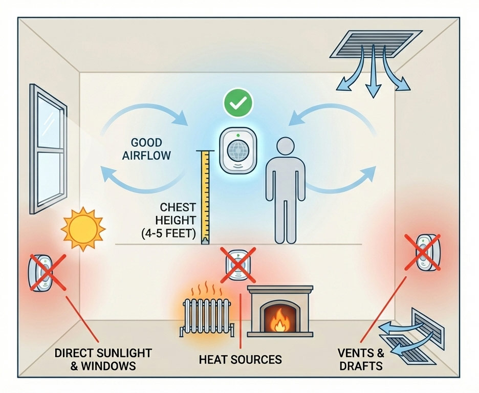 Proper hygrometer placementDelmhorst, in their article, outlines how to determine monitoring effectiveness and early mold-detection capabilities. Install sensors at chest height (4-5 feet) in central locations with good airflow, avoiding direct sunlight, heat sources, vents, and windows that create unrepresentative readings. Install sensors at chest height (4-5 feet) in central locations with good airflow, avoiding direct sunlight, heat sources, vents, and windows that create unrepresentative readings.